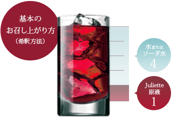 - 1ワイングラスに「ジュリエット」を香りづけ程度、少量入れます。「ジュリエット」を入れ過ぎると、別の味の飲み物になりますのでご注意ください。